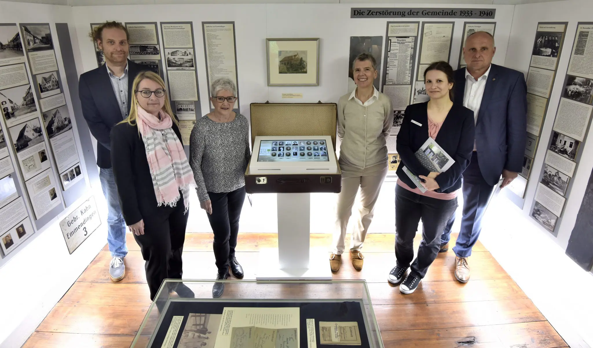 Foto: v.l.n.r. Steffen Krauth (von links), Natascha Thoma-Widmann, Carola Grasse, Dorothea Scherle, Jutta Geike und Oberbürgermeister Stefan Schlatterer sind stolz auf das Gemeinschaftsprojekt „Medienstation“ im Jüdischen Museum