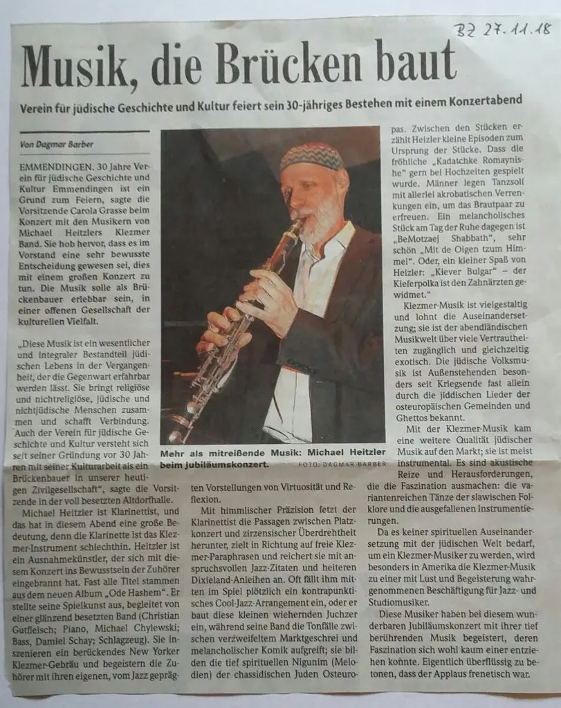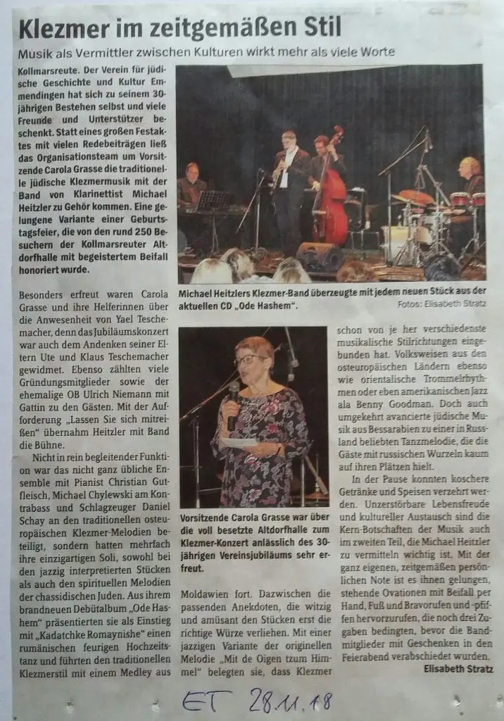 „Alljährlich veranstaltet der Verein für jüdische Geschichte und Kultur Emmendingen im Herbst einen Thementag, um Interessierten unterschiedliche Aspekte der jüdischen Kultur und Religion näher zu bringen. In diesem Jahr lautet das Thema „Musik und Judentum“. Dabei dreht sich die Veranstaltung am 17. November darum, ob es jüdische Musik gibt und wenn ja, welche Facetten sie umfasst.